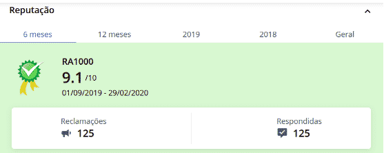 A empresa tem nota geral de 9,1 e selo RA1000 do Reclame Aqui que atesta o excelente índice de atendimento e a confiabilidade da marca e de seus serviços e produtos.