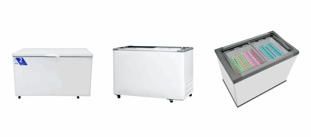 O freezer horizontal, também conhecido como freezer tipo “baú”, tem uma estrutura mais larga e baixa. A porta abre para cima, e o espaço interno é geralmente único ou com poucos compartimentos móveis.